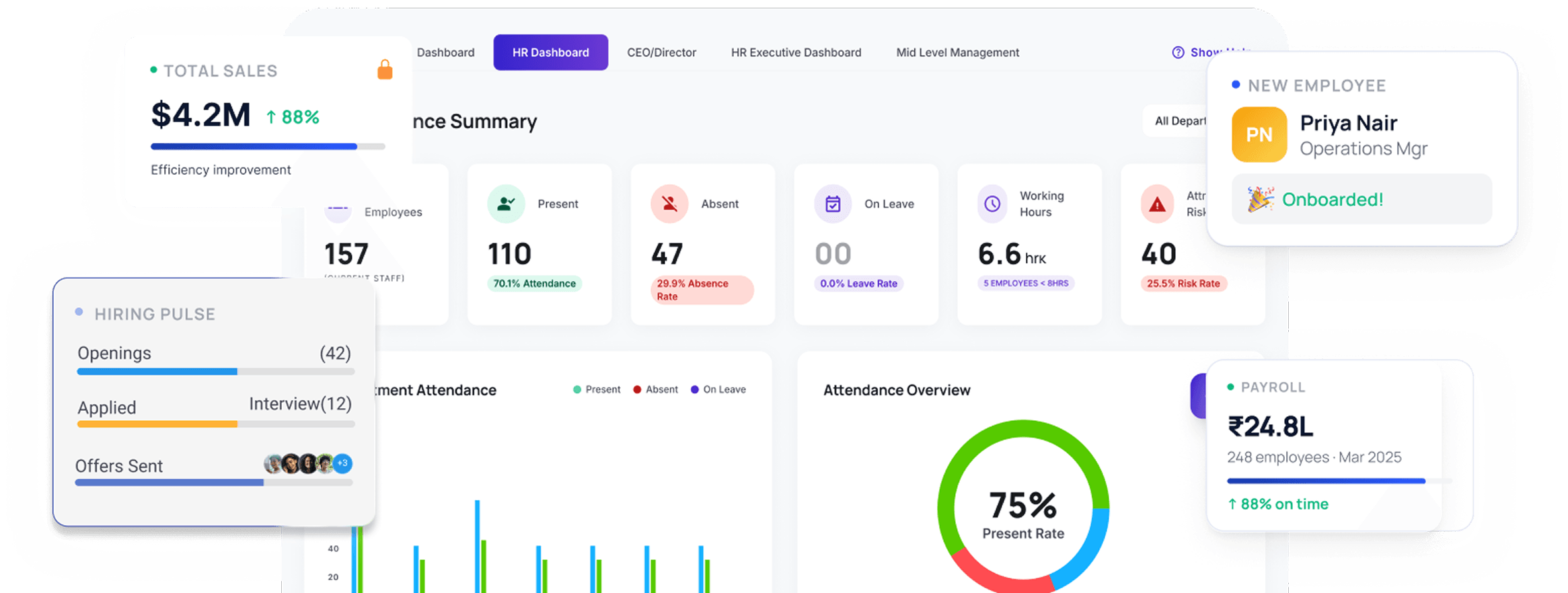 Automate payroll, attendance, onboarding, and employee desk board at one centralized place with human insights.